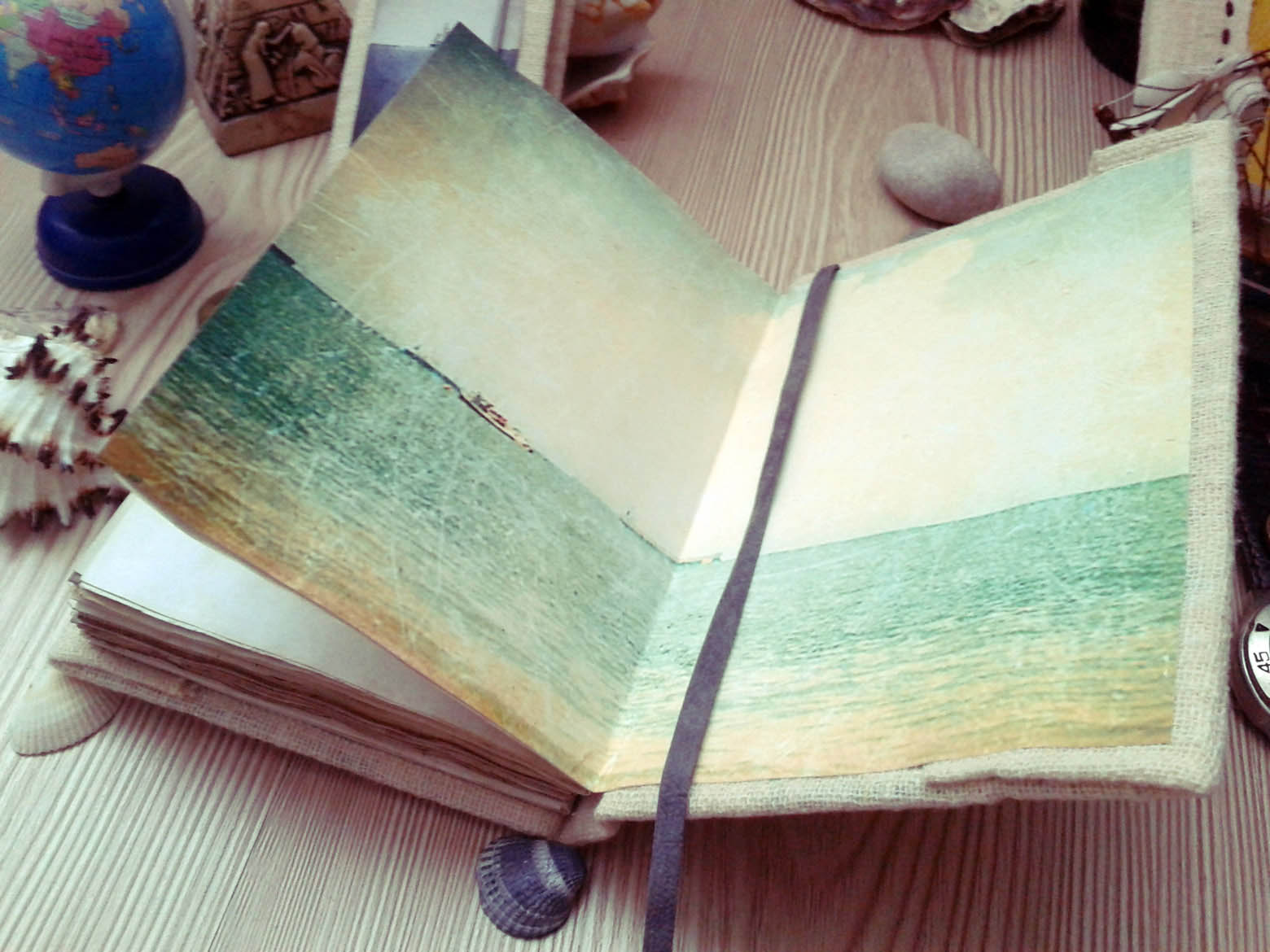 Записная книжка выполнена в светлой гамме, лицевая сторона украшена картинкой с морскими волнами, декоративным шнуром и марлей. На форзацах также изображено море. Есть ляссе из искусственной замши и удобная резинка.