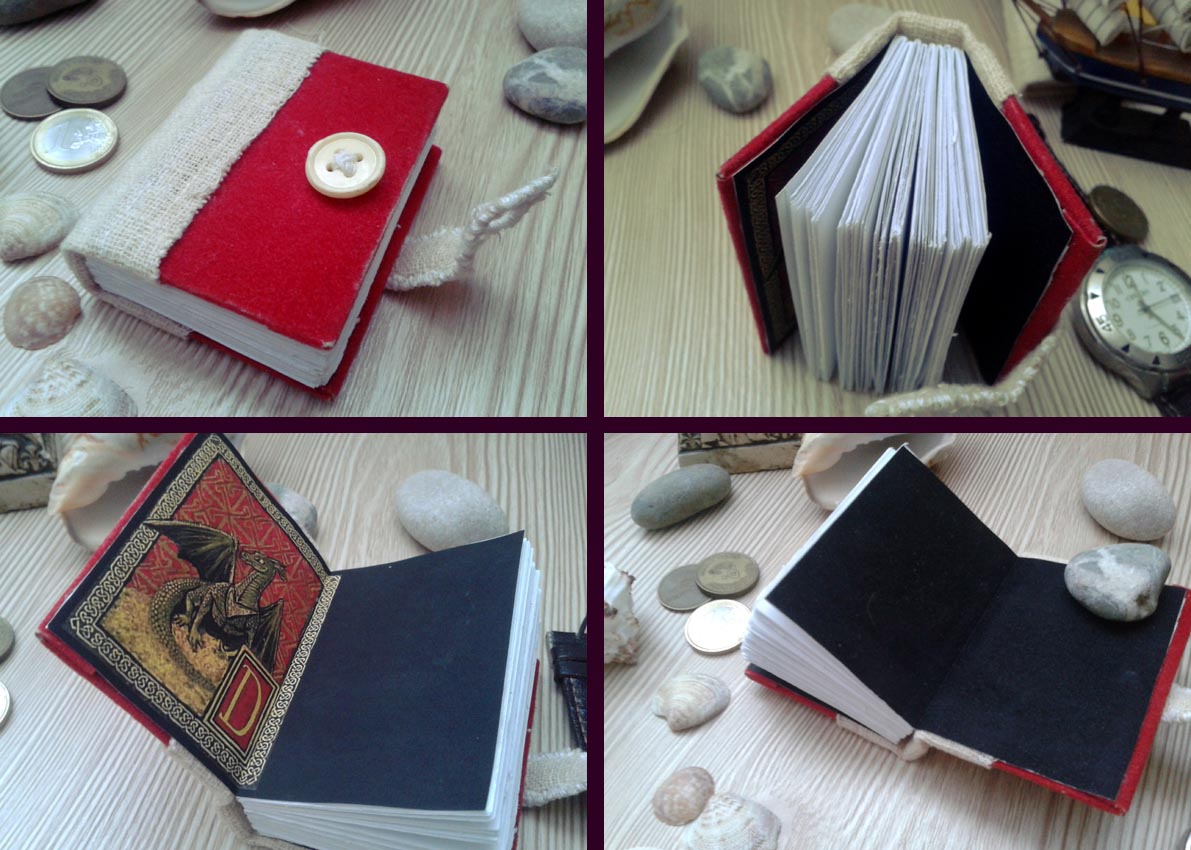 Твердый переплет, красная бархатная бумага + ткань на корешке. Застежка на пуговице. Иллюстрация дракона из средневековой книги на переднем форзаце, второй форзац – черная бархатная бумага. Идеальное сочетание ярко-красного, белого и черного цветов.