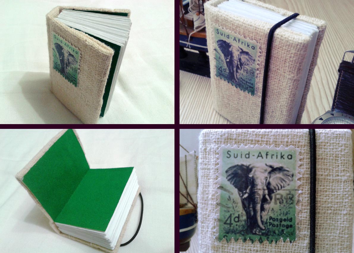 Толстенький блокнот с твердым переплетом. На обложке – маленькая картинка марки ЮАР со слоном. Форзацы – яркая зеленая бархатная бумага. Черная резинка-застежка. Листы белые.