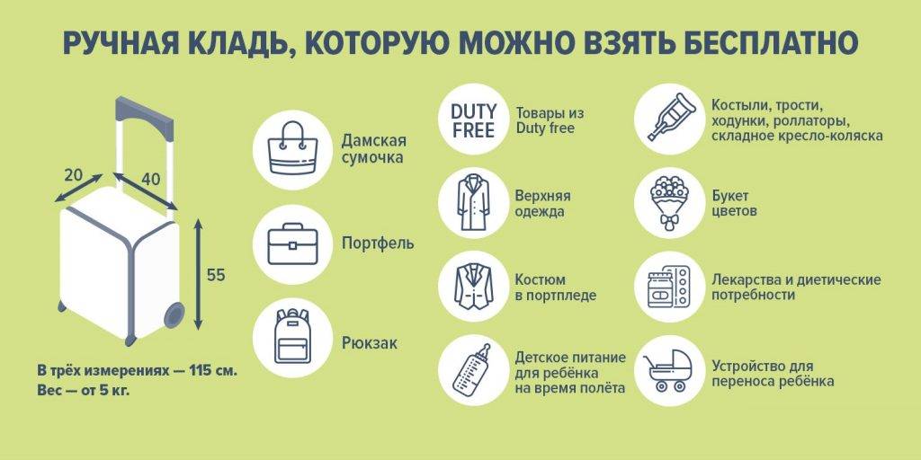 - Сумки не более 80 см объема (по сумме 3-х измерений), менее 5 кг. веса. Сюда же относят рюкзак, барсетку, детские вещи.