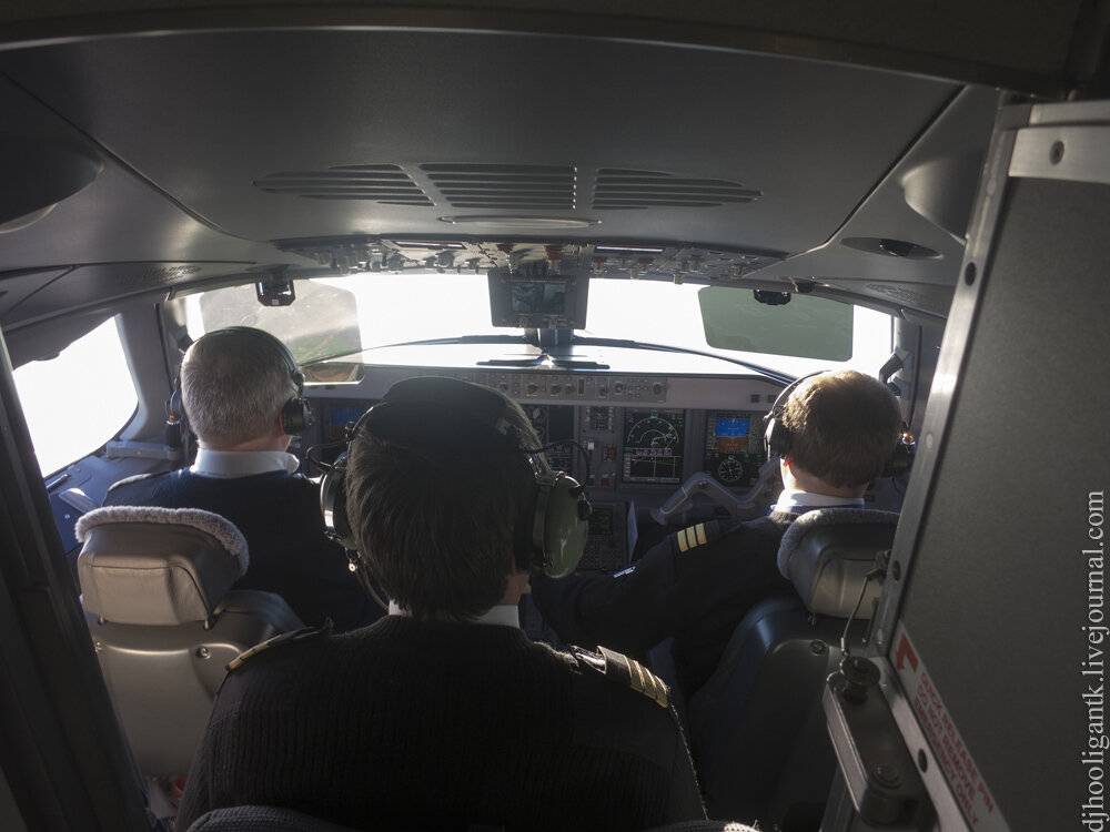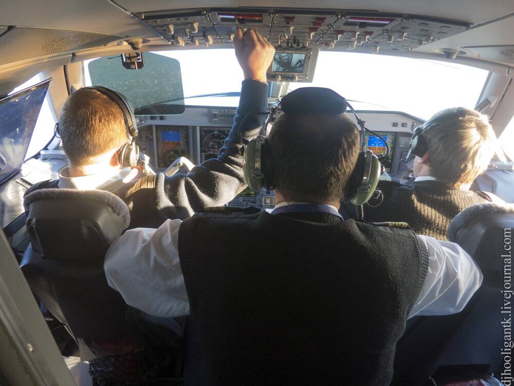 В кабине тоже тесно. Экипаж самолёта – 2 человека, поэтому кабина небольшая. Но вместо двух сегодня здесь всегда по трое.