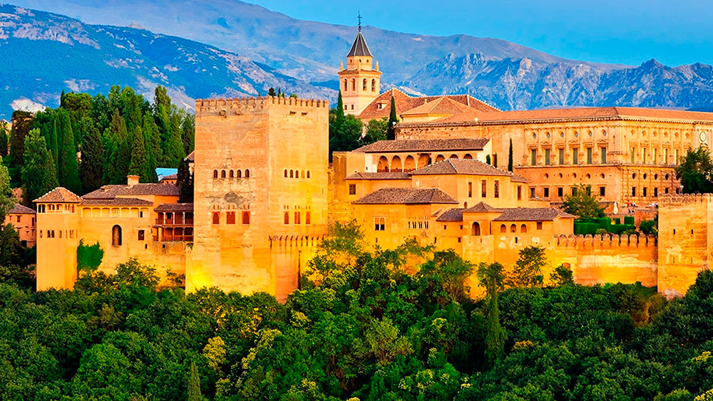В Южной Испании в бывшей столице Гранадского эмирата был построен дворцово-парковый комплекс в мавританском стиле. Это место было последним оплотом исламского государства на территории современной Испании. До наших дней дошли крепостные стены, дворцы, мечети, дома и сады. Все строения вписаны в окружающий ландшафт для гармоничного единения с природой. Дворцовый комплекс наполнен светом и журчанием воды. Здесь встречаются как крупные водоёмы, так и небольшие уединенные фонтаны. В садах растут гранатовые и апельсиновые деревья, стройными рядами высажены огромные кипарисы. С крепостных стен открывается великолепный вид на горы и леса.