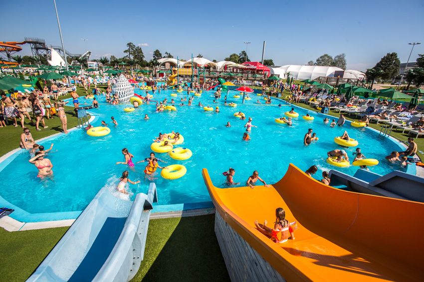 Горки и бассейны: 4 горки, 12 бассейнов, водопады, водные пушки, гейзеры, детский городок.