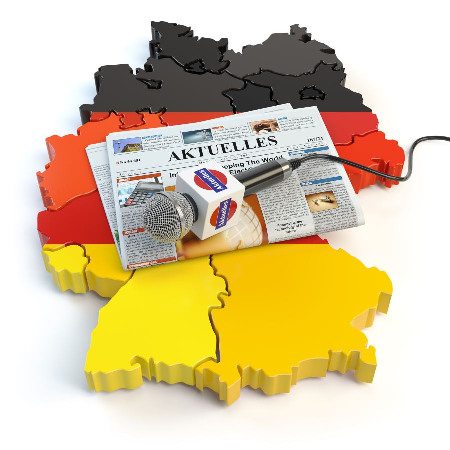 Press conference or briefing of president or premier minister of Germany concept,. Podium speaker tribune with Germany flags and coat arms. 3d illustration