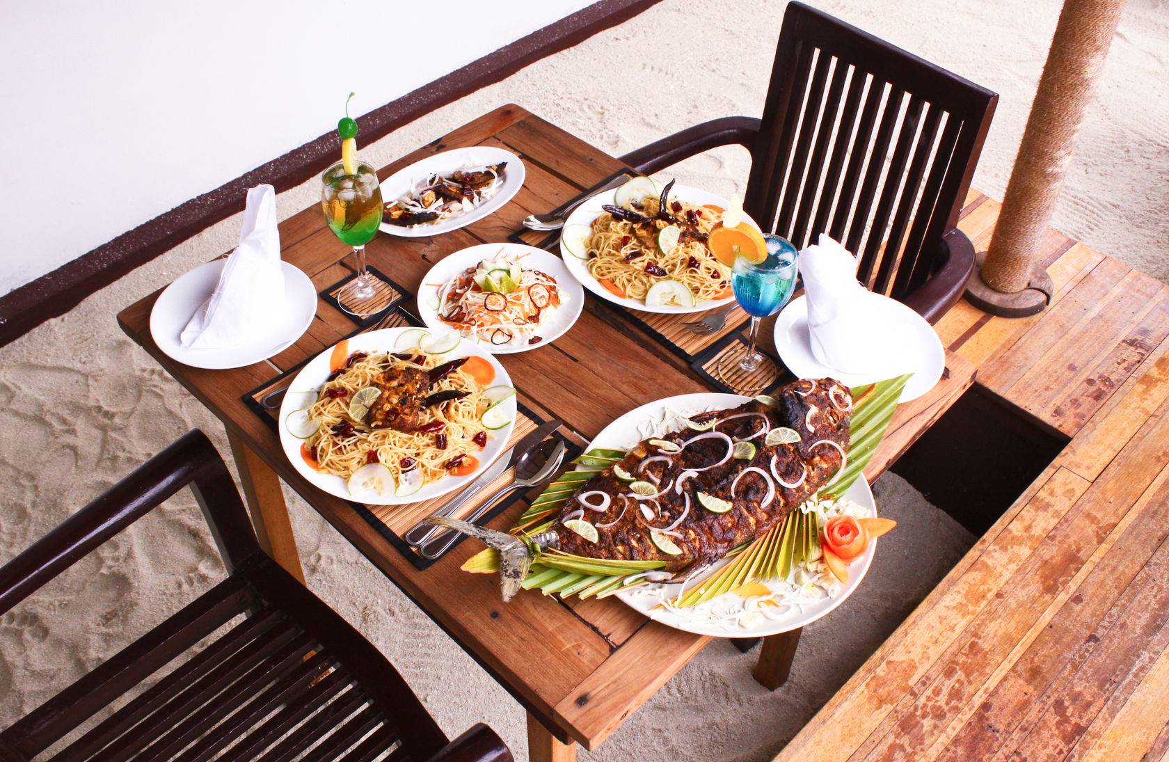Готовые тур-пакеты, купленные по низким ценам, как правило, предлагают только завтраки. Но, даже если и их не будет, можно полноценно питаться в любом ближайшем кафетерии. На Мальдивах представлено много общественных заведений, в меню которых входят блюда национальной кухни по доступным ценам. В большом количестве представлены свежие морепродукты и фрукты.