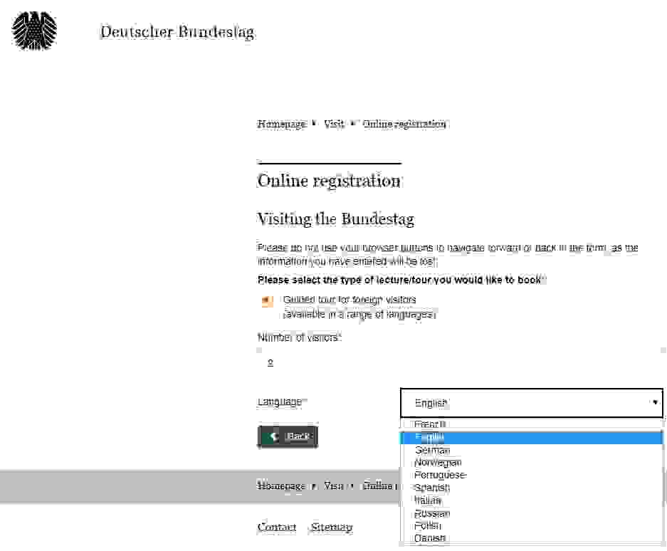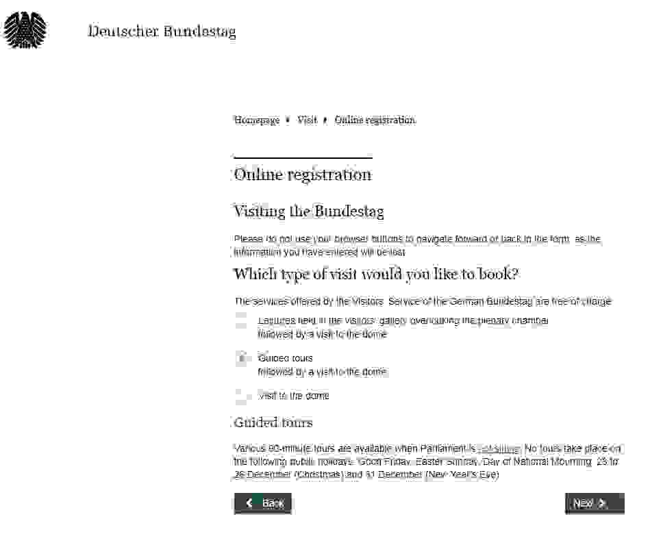 Попасть на любую из этих программ можно бесплатно, но исключительно по записи – записываться нужно приблизительно за 1-3 месяца до планируемого визита. Запись в Рейхстаг в Берлине проводят в специальном туристическом офисе рядом с достопримечательностью, а также на официальном сайте бундестага https://www.bundestag.de/en. Причём лучше сразу открывать страницу для записи https://visite.bundestag.de/BAPWeb/pages/createBookingRequest/viewBasicInformation.jsf?lang=en.