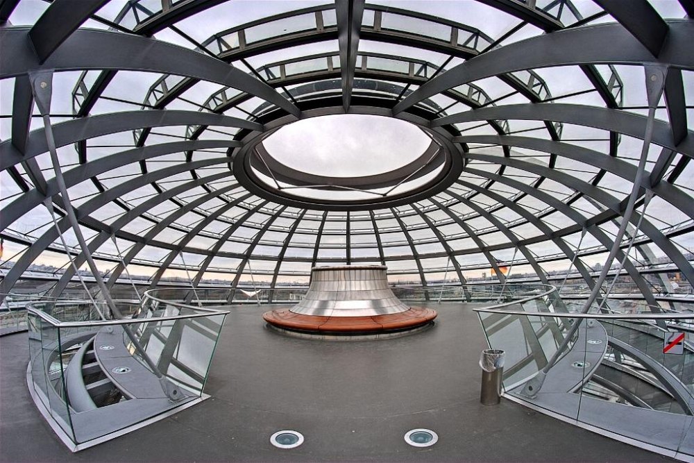 Главное украшение Рейхстага – великолепная полусфера, созданная из прочнейшего стекла и металла – своеобразная терраса диаметром 40 метров и высотой 23,5 метра. Подняться сюда можно на лифтах. На крыше, в куполе, одновременно находится тысяча человек. Под вершиной купола – смотровая площадка, откуда открывается круговая панорама Берлина. Купол устроен так, что посетитель видит не только панораму города, но и зал заседаний парламента.