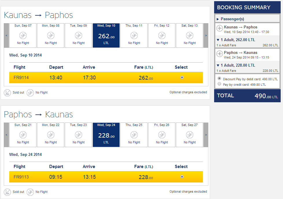 Другой европейский лоукостер — Ryanair — также позволяет дешево добраться до Кипра самостоятельно: билеты в Пафос из Каунаса и обратно можно найти за 490 литовских литов (≈6700 рублей). Билеты ищите на сайте авиакомпании — ryanair.com или на сервисе Skyscanner.