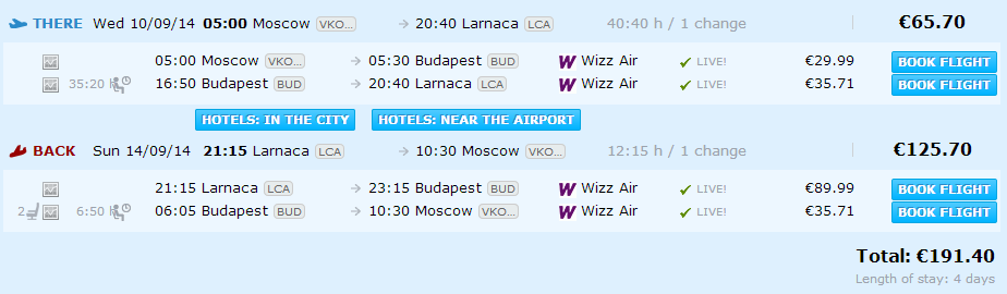 Благодаря тому, что Wizz Air летает из Москвы в столицу Венгрии, можно сформировать относительно недорогой маршрут перелета в Ларнаку через Будапешт. Вполне можно уложиться в 190 евро (≈9000 рублей), а если повезет с акцией, то еще дешевле. Конечно, это не самый удобный вариант, но зато один из самых бюджетных для москвичей. Хотя, возможно, проще будет все-таки лететь на традиционных авиакомпаниях, зато с большим комфортом, хоть и придется заплатить на пару тысячу больше.