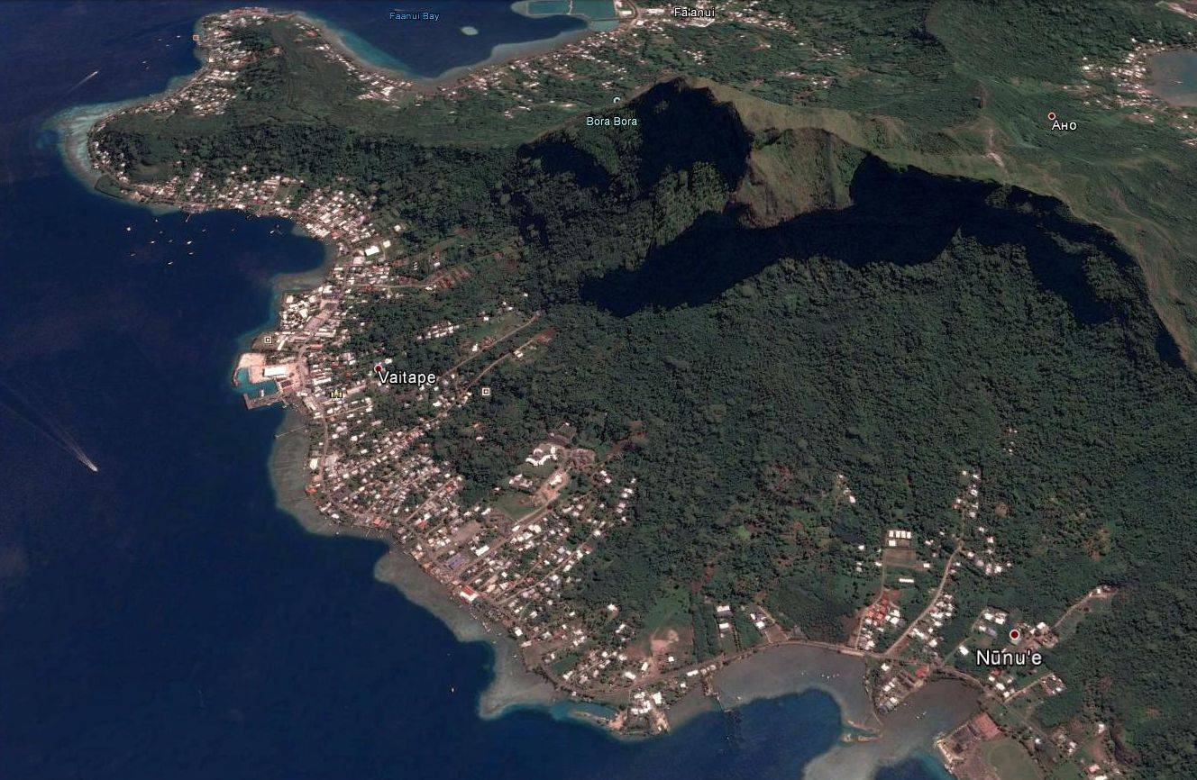 Вайтапе — центральное поселение о. Бора-Бора, вид со спутника. Нажмите для увеличения.