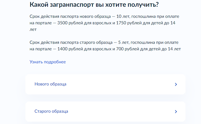 Выберите тип документа. Услуга называется «Загранпаспорт», ее страницу можно найти через поиск на главной или в списке актуальных услуг. В первую очередь система попросит выбрать тип документа: старый или новый образец. Удобно, что сразу прописываются суммы государственных прав: