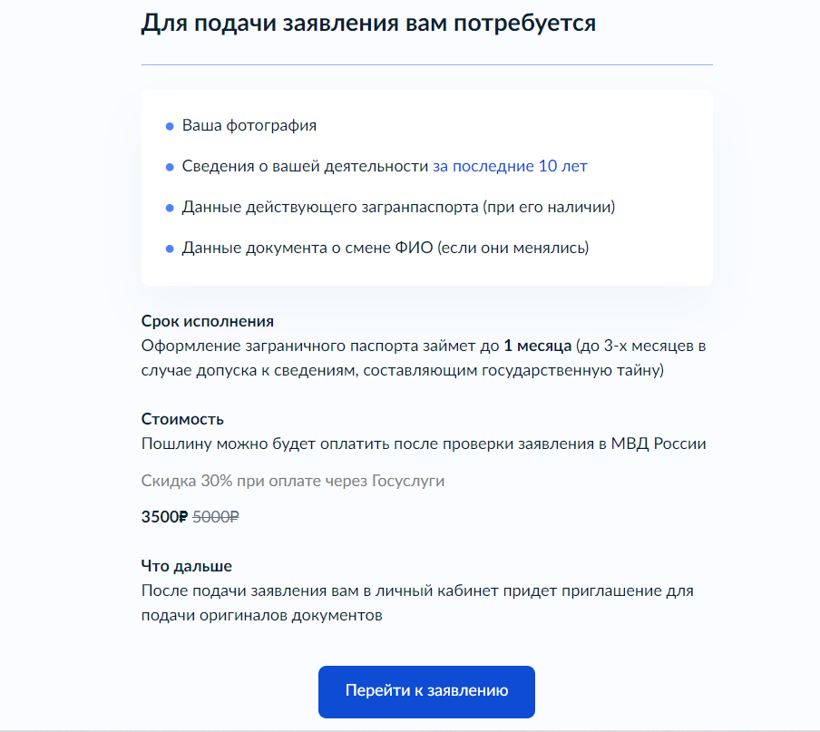 Ознакомьтесь с условиями выдачи паспорта. Что касается элемента сведений о деятельности, то это может быть свидетельство, диплом, копия трудовой книжки, военный билет, удостоверение индивидуального предпринимателя. Если все понятно, можно все предоставить, нажимайте кнопку «Перейти к заявке”.