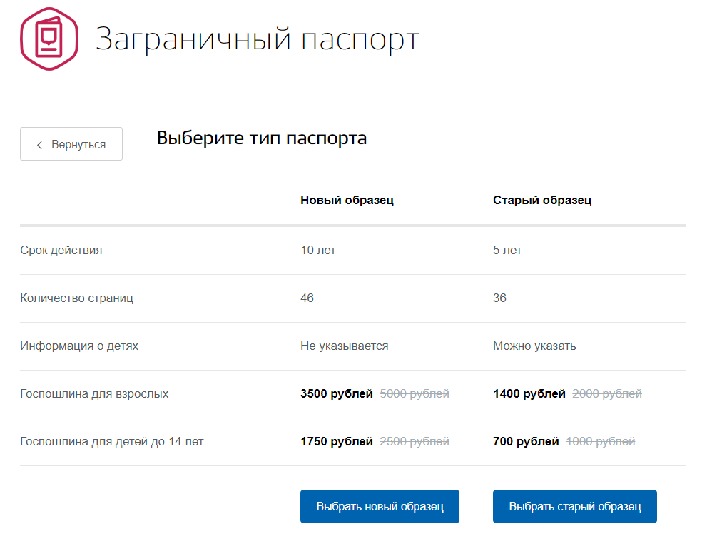 | Загранпаспорт старого образца | 1 400 рублей (2 000 рублей при обычной оплате) |