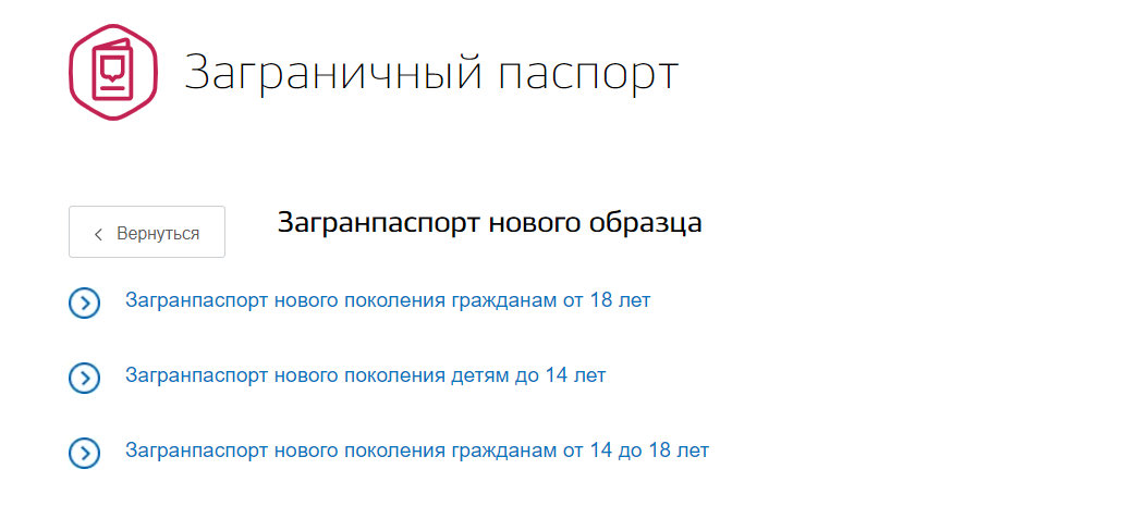 - Выбрав загранпаспорт нового образца, нужно указать, на кого он будет оформляться: на совершеннолетнего гражданина, на подростка от 14 до 18 лет или на ребёнка в возрасте до 14 лет.