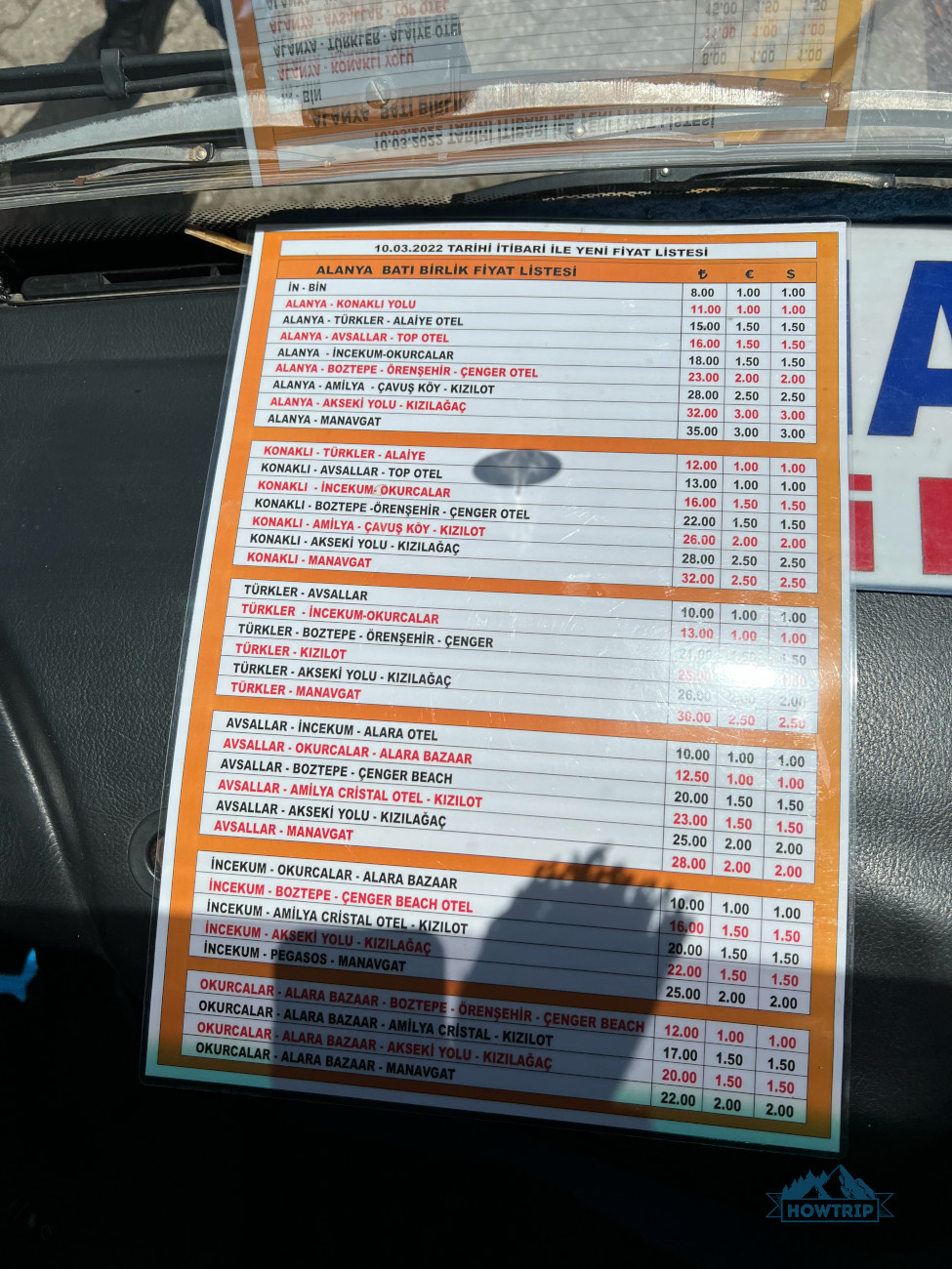 Общественный транспорт. Ценники на проезд на не дальние расстояния в пределах 13-20 лир в одну сторону. Например, между поселками одного курорта: Кемер-Чамьюва или Кемер-Текирова. Мы ездили от Аланьи до Авсаллар (минут 25-30) за 16 лир. Такси при этом стоит примерно 250 лир в одну сторону.