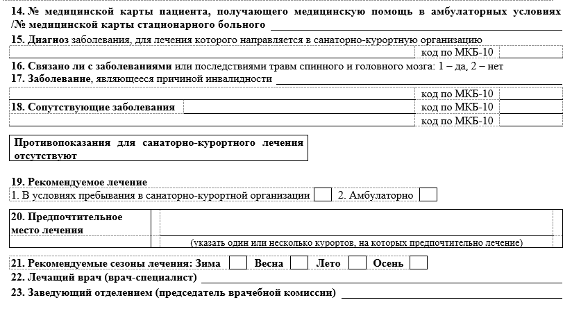 Пункты с 19 по 21 заполняются в соответствии с лечебными показаниями. В этих графах указывается предпочтительный климат, условия пребывания в организации санаторно-курортного лечения, наиболее благоприятный сезон и санаторные зоны.
