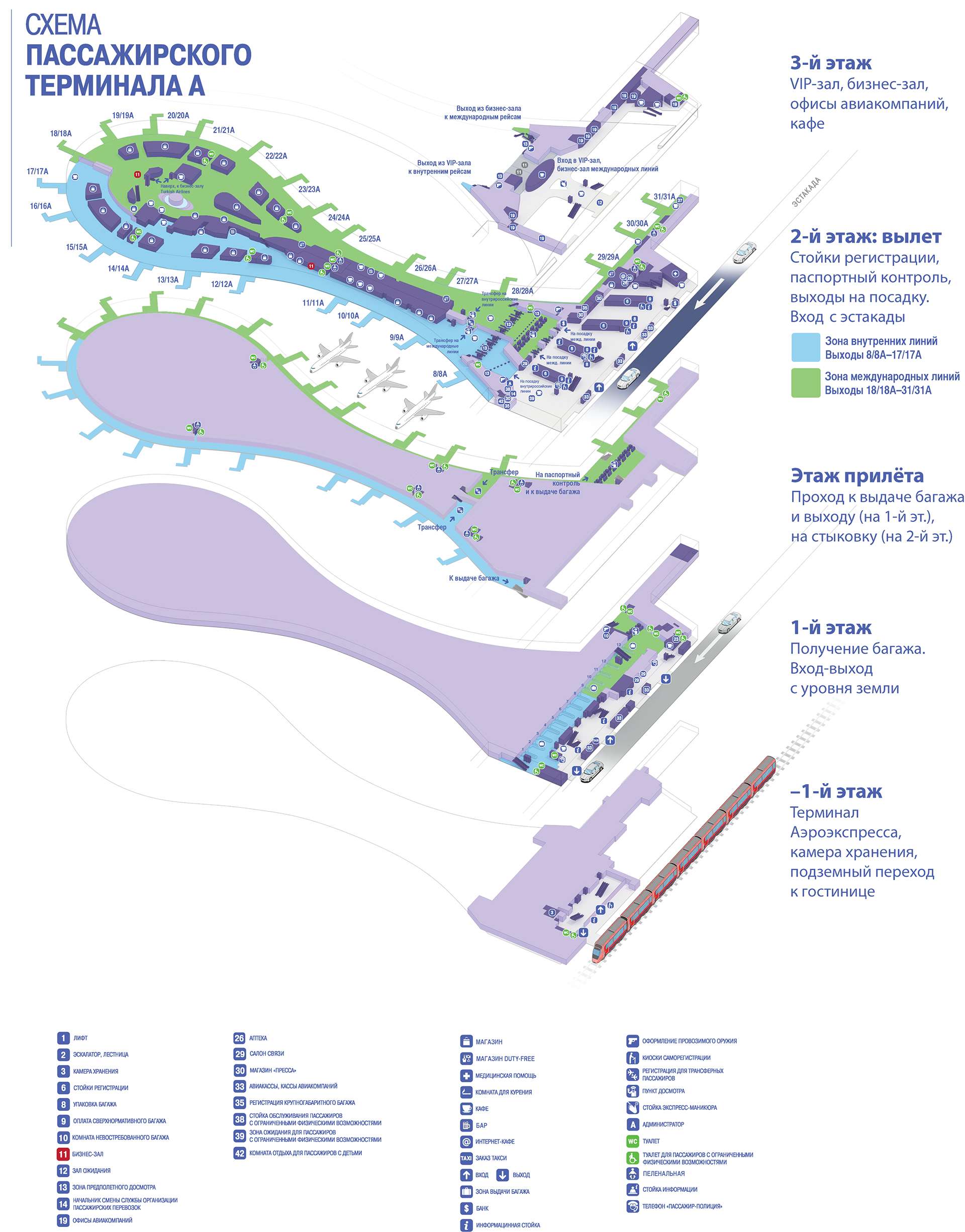 Важно! С августа 2015 года схема выхода из терминала А изменена. Возможность пользоваться выходом из зоны вылета, расположенную на втором уровне терминала А, на эстакаду, ограничена