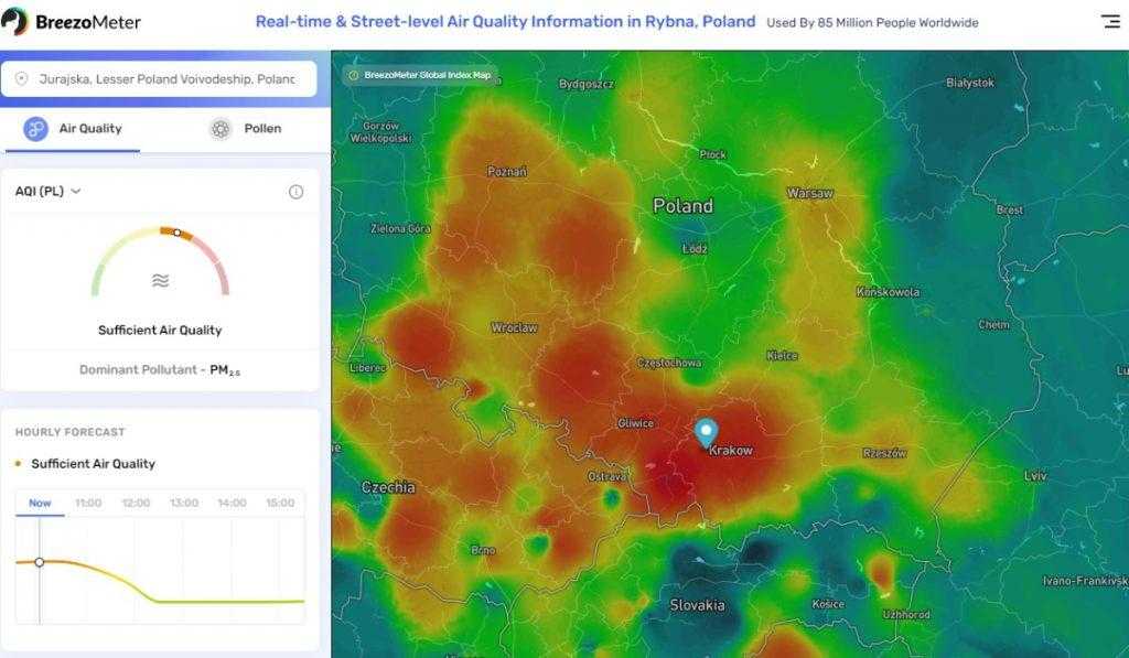 Уровень загрязненности в Польше превышает все нормы в несколько раз. Данные портала BreezoMeter. Фото: breezometer.com
