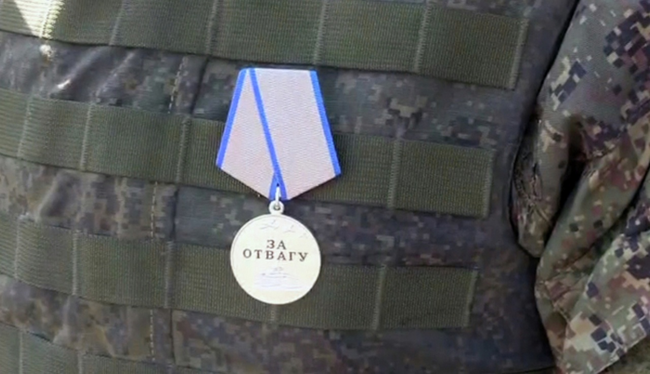 Почётная для русского солдата медаль «За отвагу» на груди участника спецоперации в Донбассе.