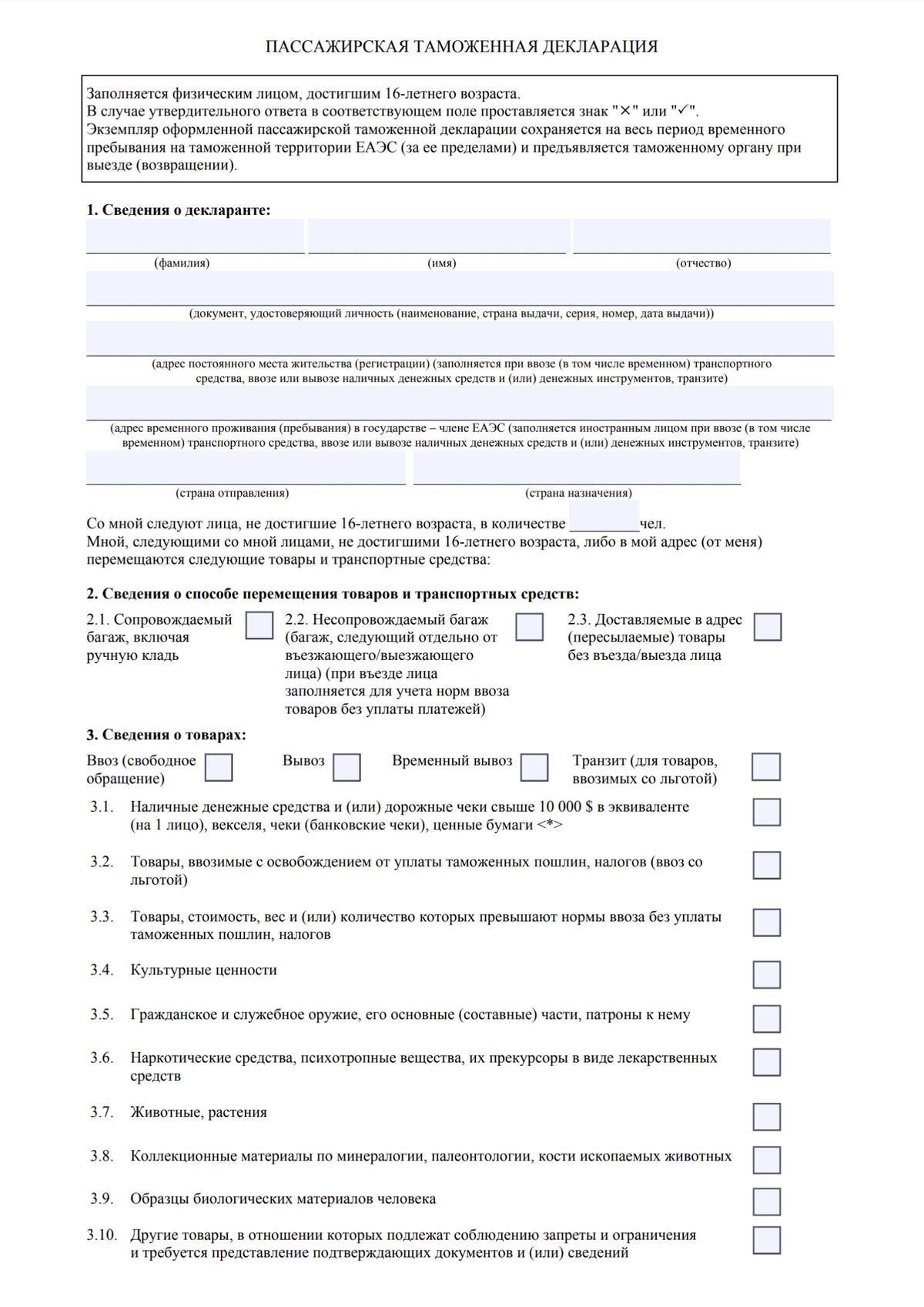 Бланк декларации есть на сайте Федеральной таможенной службы — советую рассмотреть его и заполнить заранее. Впрочем, в аэропорту тоже будут лежать чистые бланки. В декларации пассажир указывает данные о себе и товарах, способах перевозки. Подробнее о том, как заполнять документ, что можно и нельзя вывозить из страны, Т—Ж уже писал в отдельной статье.