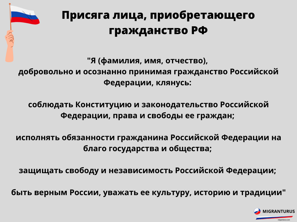 При получении гражданства РФ в 2022 произносится присяга, текст которой утвержден федеральным законодательством. Это последний этап, после которого в течение 1-2 недель заявитель получает паспорт и становится гражданином России.