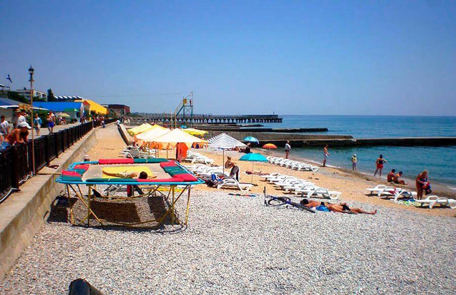 Песчано-галечный пляж шириной 30 метров тянется вдоль набережной поселка. Территория разделена на несколько участков, разграниченных волнорезами. В пляжной зоне можно найти кабинки для переодевания, пункты проката шезлонгов и водного оборудования. Инфраструктура сосредоточена прямо на набережной, где работают кафе, магазины, киоски с пляжными принадлежностями.