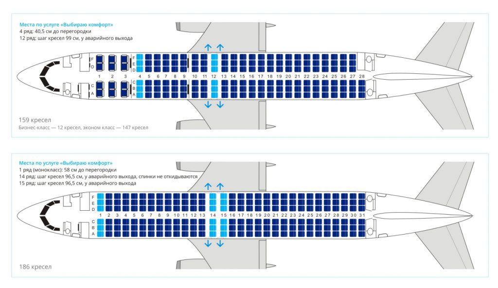 Но у Вoeing 737 иногда может различаться планировка, выделяют самолеты вместимостью 156 и 186 кресел, из-за этого ряды сдвигаются и эконом-класс уменьшается.