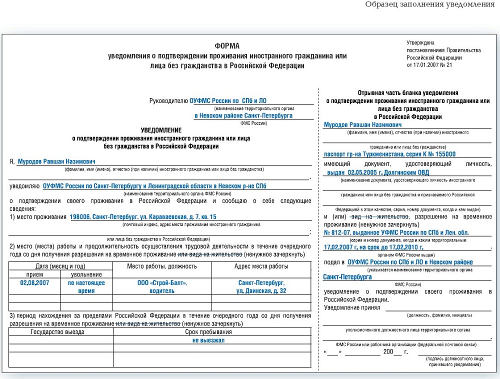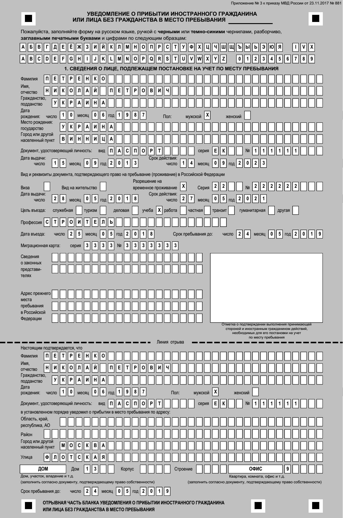 Образец заполнения уведомления о прибытии иностранного гражданина