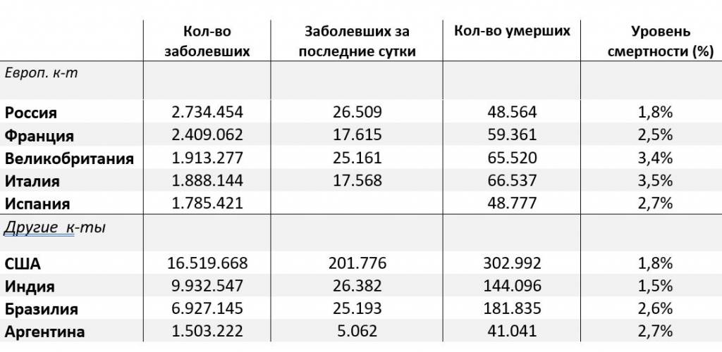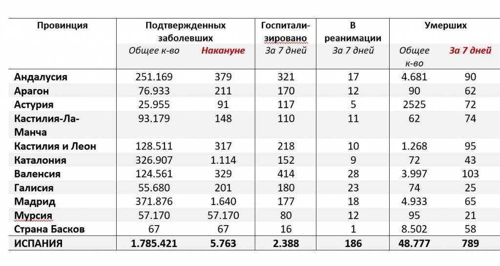 | В Испании зарегистрировано:1.785.421 зараженных коронавирусом COVID-19; 48.777 умерших; 5.763 заболевших накануне. | 2,4% – по всему миру (75,1 млн заболевших, 1,67 млн умерших); 3,4% – в Великобритании;2,7% – в Испании;2,5% – во Франции; 1,8% – США; 1,8% – в России. |