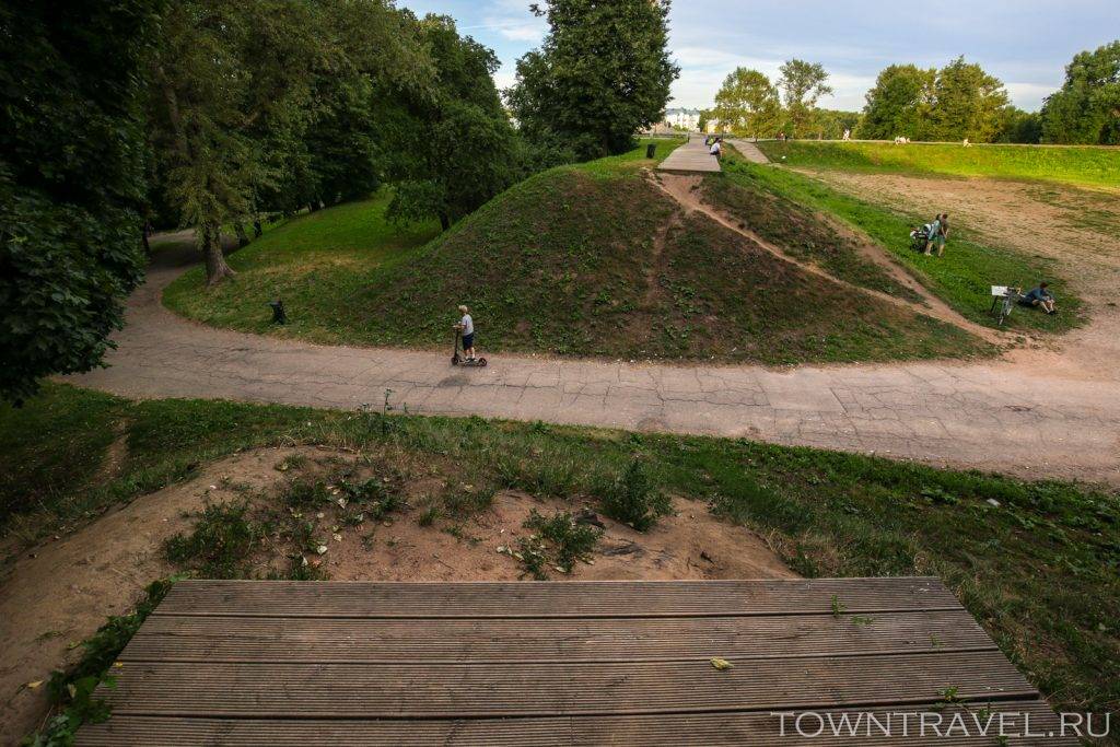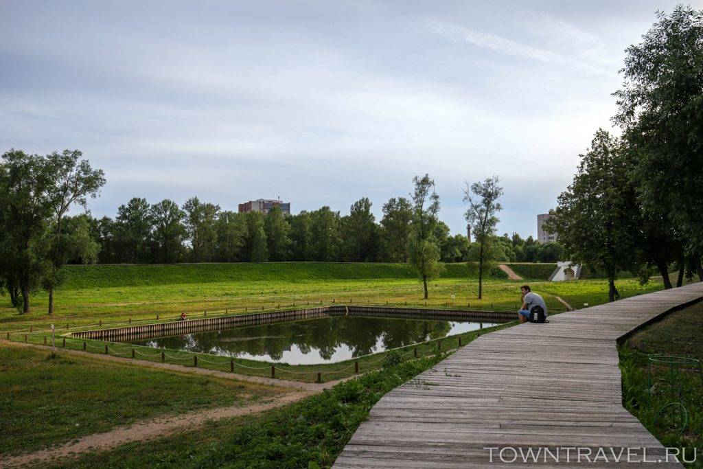 По верхушкам земляных валов проложены дощатые пешеходные дорожки.