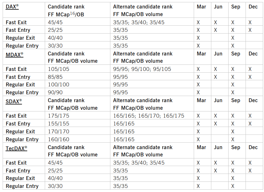 Комитет, занимающийся пересмотром состава корзины, составляет так называемый шорт-лист компаний, из числа которых и могут отбираться новые компоненты Дакса. До сентября 2021 г. этот список выстраивается на основе free—float капитализации и торгового оборота акций. Чем эти показатели выше, тем выше и позиция акции в шорт-листе. Для текущей редакции Дакс список включает 45 компаний.