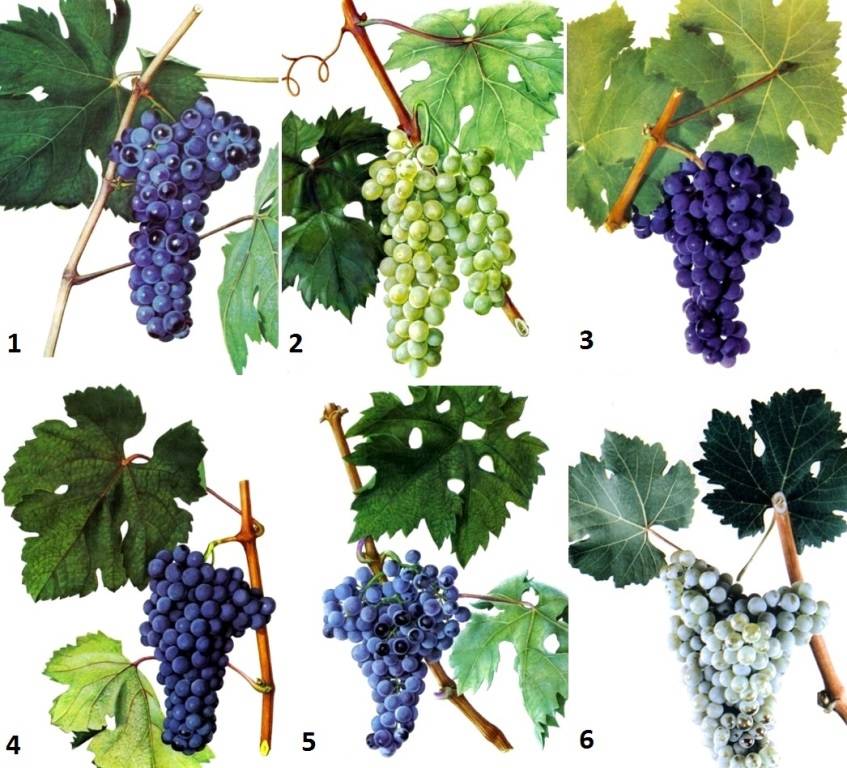 Российские сорта винограда: 1 – Цимлянский черный; 2 – Сибирьковый; 3 – Варюшкин; 4 – Красностоп Золотовский; 5 – Плечистик; 6 – Нарма ( rusvina.ru)