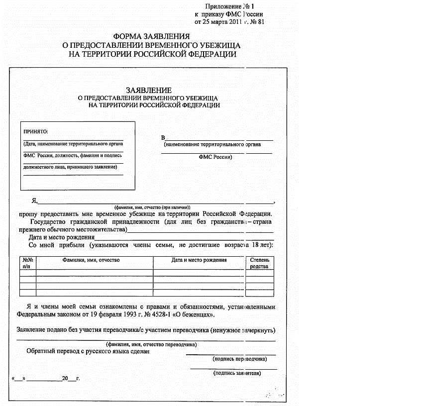 Форма заявления о предоставлении временного убежища на территории РФ