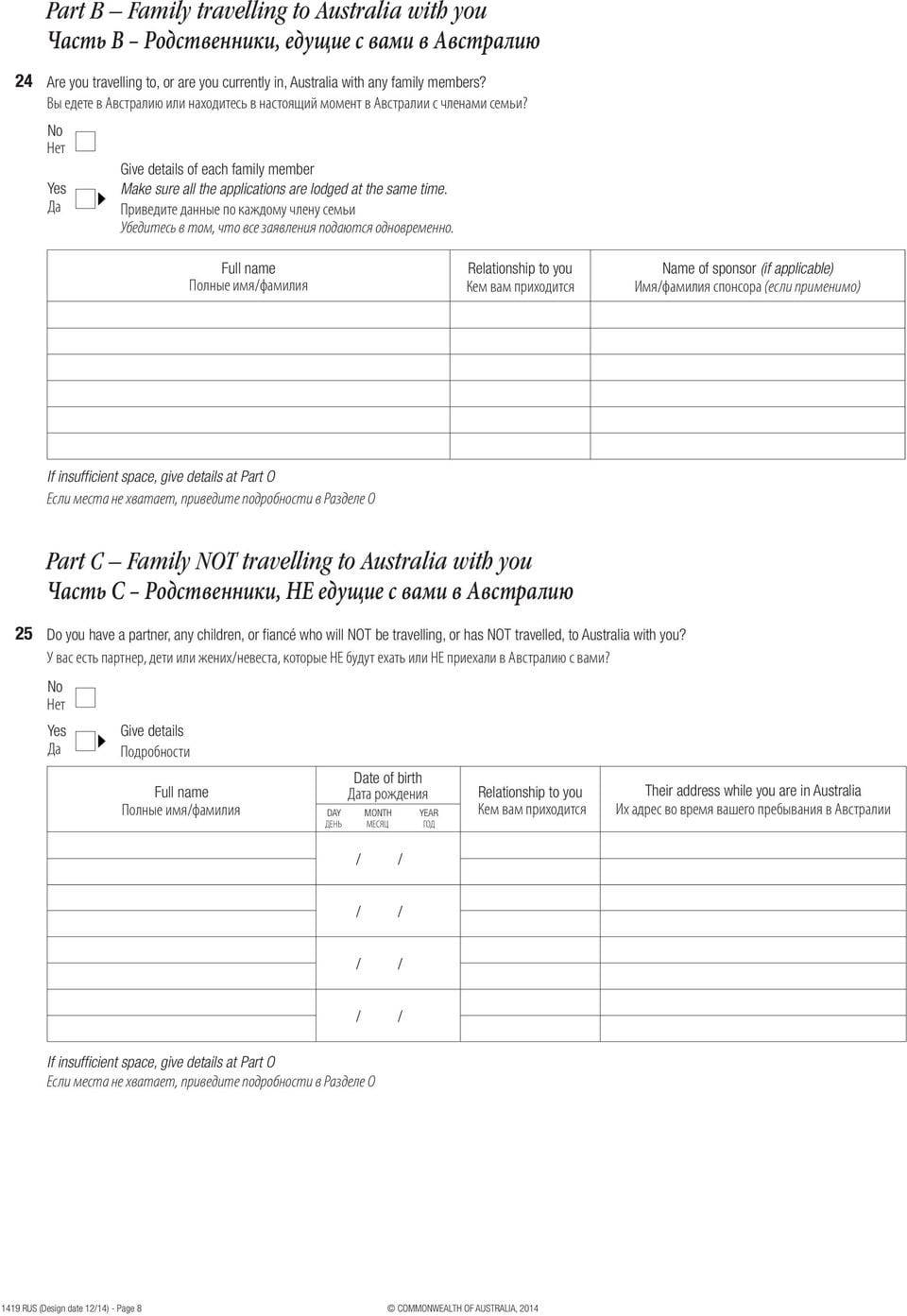 - Форма 47sp — данное заявление заполняется лицами, подающими заявление на получение партнерской визы за пределами Австралии, а также лицами, подающими заявление на получение партнерской визы в Австралии. Если вы подаете заявление за пределами Австралии, вы будете подавать заявление на миграцию. Если вы подаете заявление в Австралию, вы будете подавать заявление на постоянное место жительства.