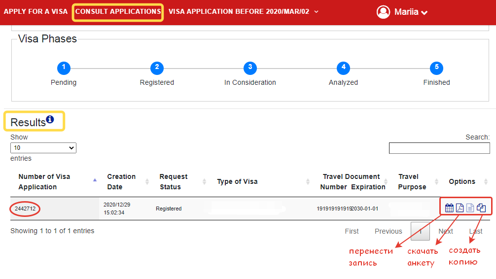 Все созданные вами заявки будут отображаться в системе в меню Consult Applications — там вы можете перенести запись на другое число, скачать готовый файл анкеты и создать новое заявление на основе уже введенных вами данных (удобно при подаче семьей или группой).
