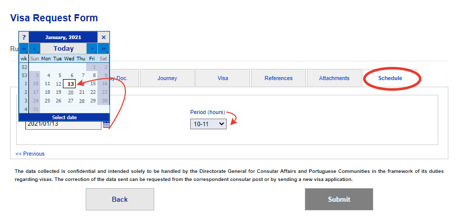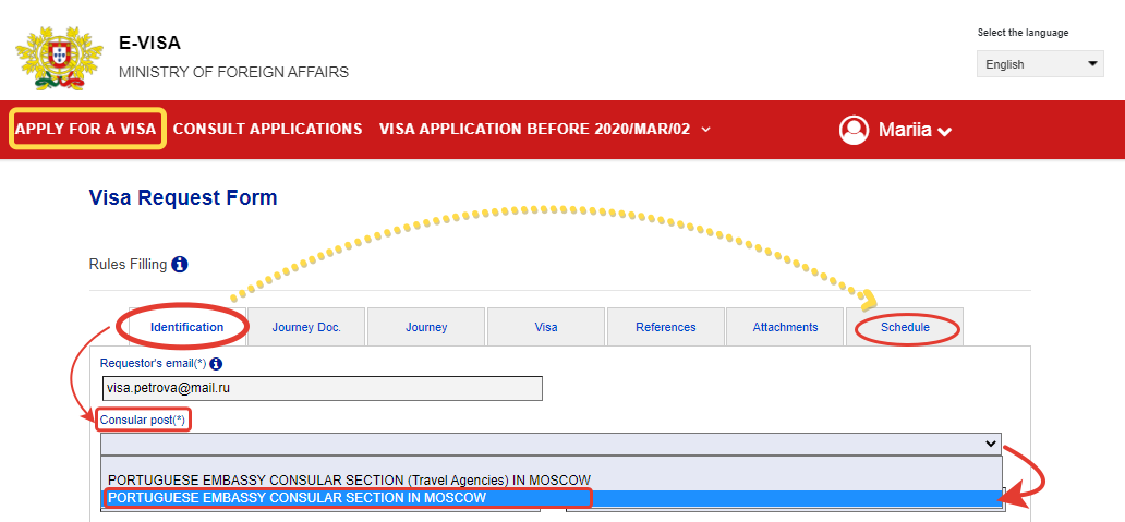 Внимание: если хотите подаваться именно в Посольство, в этой графе обязательно должно быть указано PORTUGUESE EMBASSY CONSULAR SECTION IN MOSCOW; если выбрать первый вариант (For Travel Agencies), то вкладка Schedule пропадет и после сохранения анкеты в системе повторно заполнить заявление и записаться на прием в консульский отдел будет уже нельзя. Придется обращаться в визовый центр.