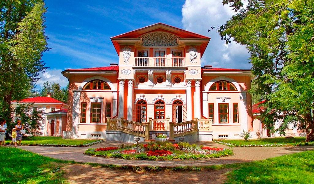 Усадьба представляет собой двухэтажную постройку прямоугольной формы с мансардой в классическом стиле. В качестве декора для стен розового цвета использовались белые барельефы, крыша – целиком красного цвета.
