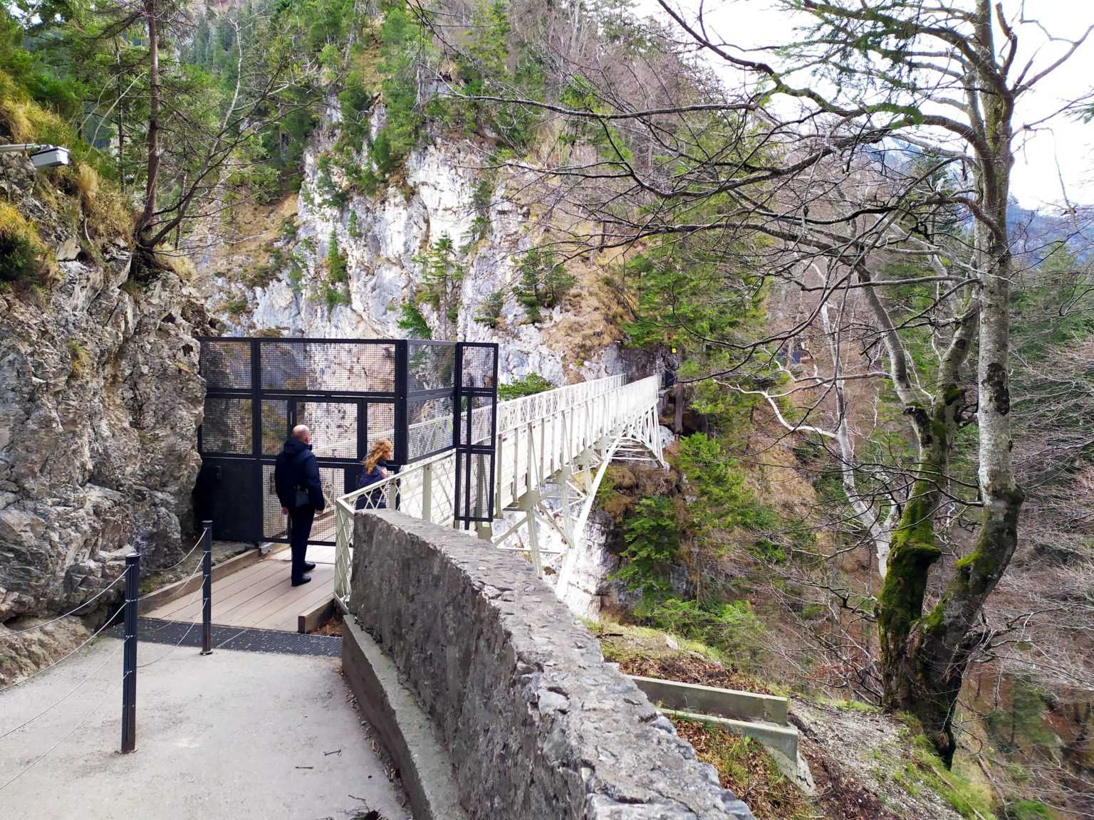 Чтобы попасть в замок Нойшванштайн, идти по мосту не надо. Мы шли по дорожке, фотографируя долину и показавшийся за поворотом замок. Напротив входа есть площадка для отдыха. С платформы, нависающей над обрывом, у нас получились самые красивые фотографии замка Нойшванштайн.