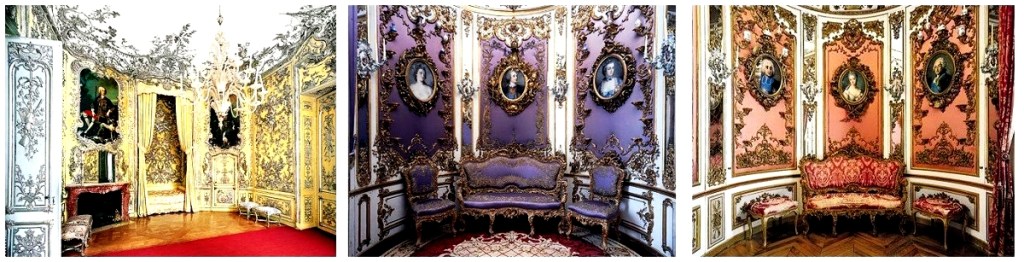 Здесь всего слишком: слишком много позолоты, слишком много росписи, вышивок и гобеленов, зеркал и прочих красивостей для невзыскательного глаза неискушенного зрителя. 10 симметрично расположенных роскошных залов, открытых для осмотра. Все они проходные. Самые крупные — Восточный гобеленовый, Приемный, Спальня, Обеденный и Западный гобеленовый залы — разделяют четыре кабинета: Желтый, Лиловый, Розовый и Голубой.