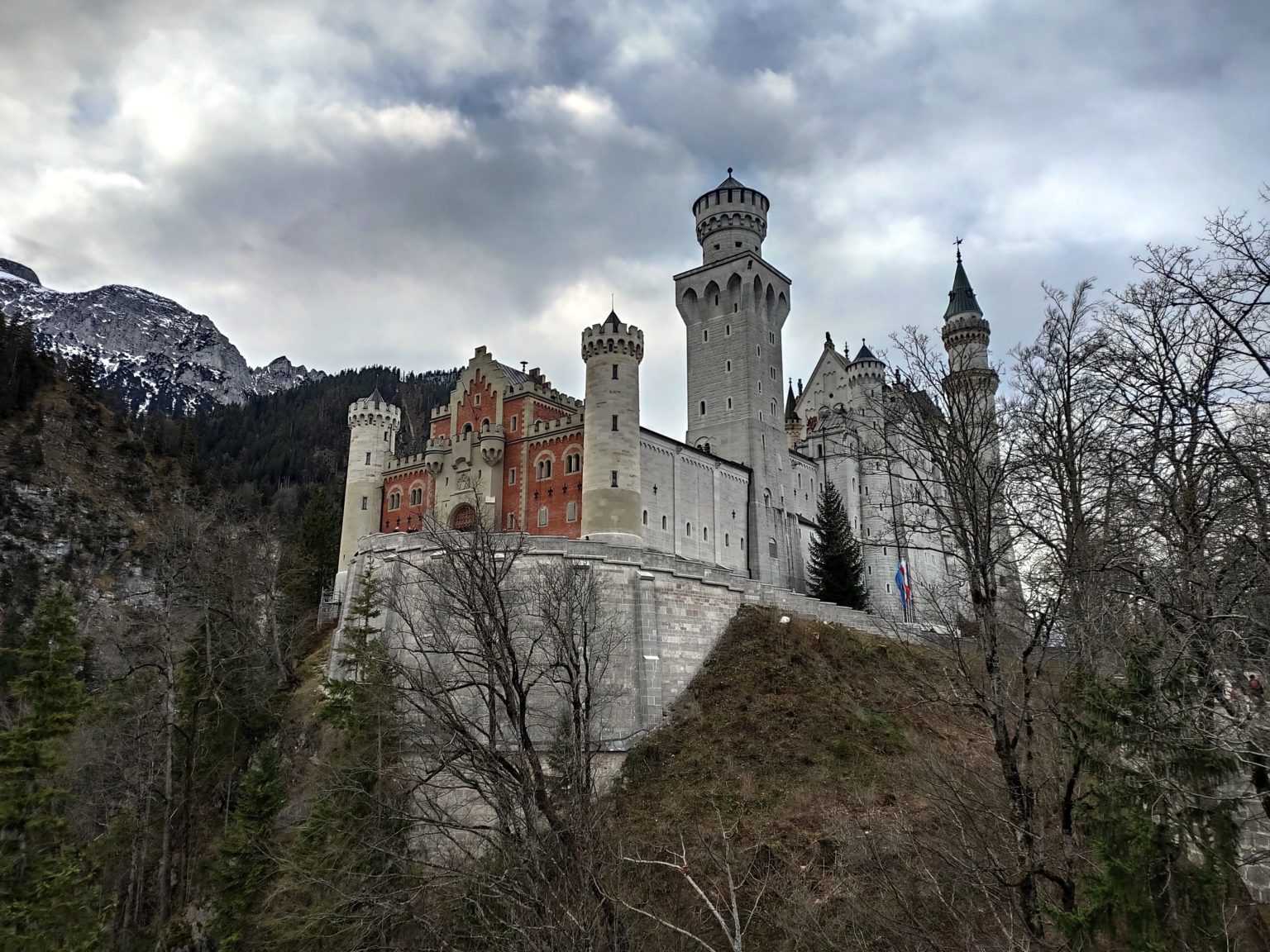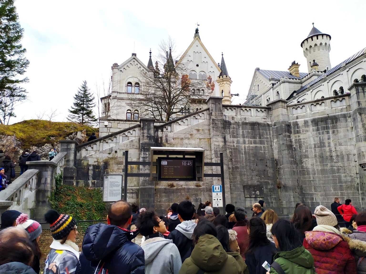 Наверх к замку Нойшванштайн мы поехали на автобусе-шаттле. Несмотря на довольно раннее время (около 10:00), на остановке уже выстроилась очередь. Автобус привез нас к мосту Мариенбрюке (Marienbrücke), откуда мы надеялись сфотографировать знаменитый вид на замок. К сожалению, из-за сильного ветра, мост был закрыт.