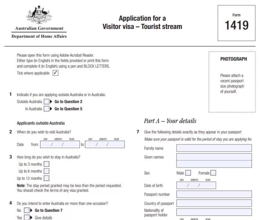 Анкета заполняется латинскими буквами на английском или русском языках. Образец анкеты с правильным вариантом заполнения можно найти на официальном сайте посольства Австралии в России. Для туристической или гостевой бумаги заполняется форма 1419, а для деловой — 1415. При подаче запроса в режиме онлайн анкета заполняется в электронном виде.
