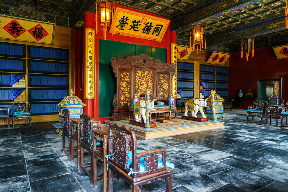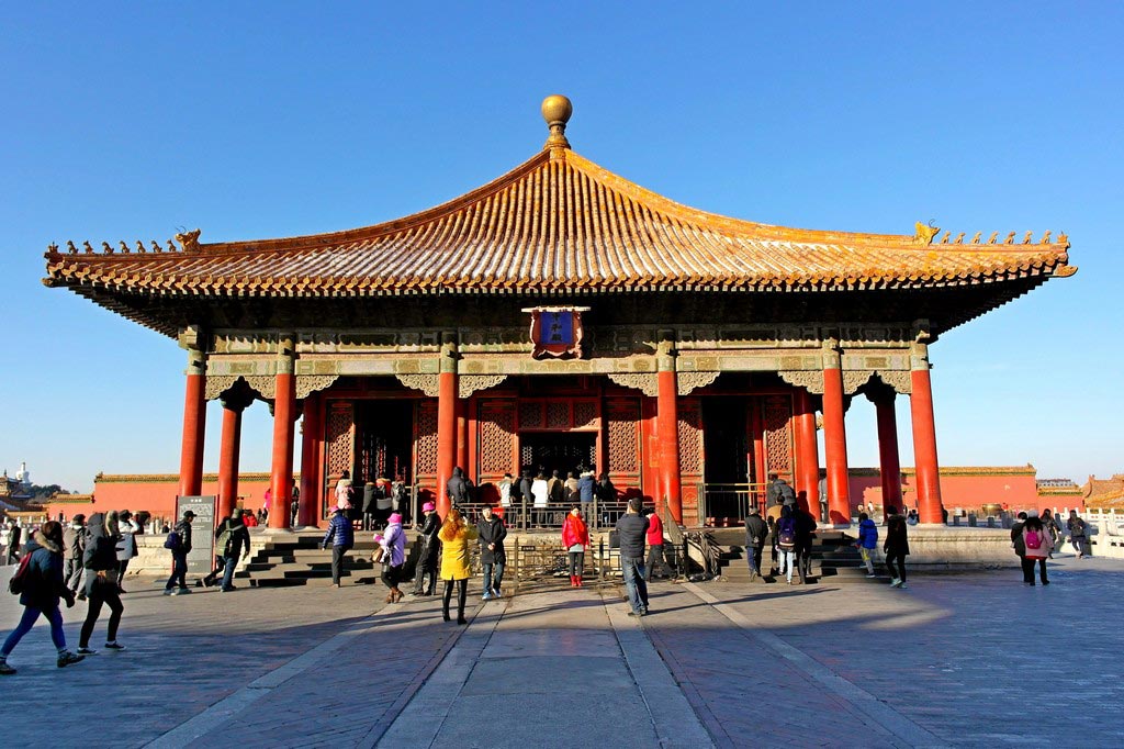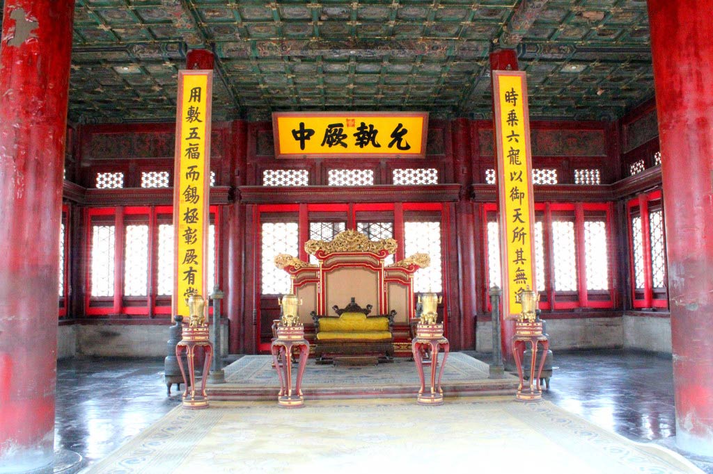 “Запретным город назвали потому, что вход в него был закрыт для простых смертных. Доступ для титулованных особ открывался по торжественным случаям и только до Зала Высшей Гармонии (Тайхэдянь), где император устраивал официальные церемонии и вёл переговоры с дипломатами. По богатству украшений Тайхэдянь не имел себе равных во всём Китае. Зал поддерживают 72 колонны. Повсюду: на колоннах, на полу и в орнаментах — присутствуют изображения драконов. В северной части зала установлен императорский трон, вырезанный из сандалового дерева. Над троном под потолком разместился самый знаменитый дракон, который держит в своей пасти жемчужину. Китайцы верили, что дракон охраняет власть императора — если на престол взойдёт самозванец, то жемчужина упадёт ему на голову.