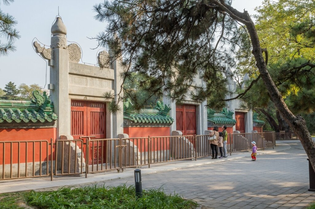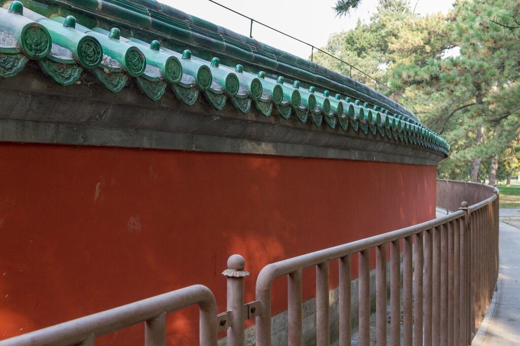 Алтарь окружен низкой стенкой круглой формы (круг — символ Неба). С каждой стороны света внутрь ведут церемониальные ворота. Западные ворота — тройные, с 6 столбами-опорами. Остальные ворота — одинарные, с двумя колоннами. Створки ворот и стены выкрашены в красный цвет. Черепица — зеленая.