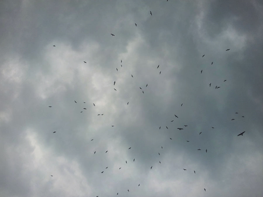 Отбросив первый до пошлости плоский вариант, имеем три неплохих способа (хотя их может быть до бесконечности много), при помощи которых можно попытаться описать то, что я чувствовал в один прекрасный ненастный день близ мыса Алчак-Кая, когда смотрел на кружащих в небе чаек. Все три способа по-своему хороши, а все вместе они особенно удачно справляются с поставленной целью (при условии, что читатель в курсе, почему у меня из горла вырывается крик “Хичкок”, и что за мужик смотрит на спираль из птичек на фото выше – точнее, почему он ее видит и что она для него значит).