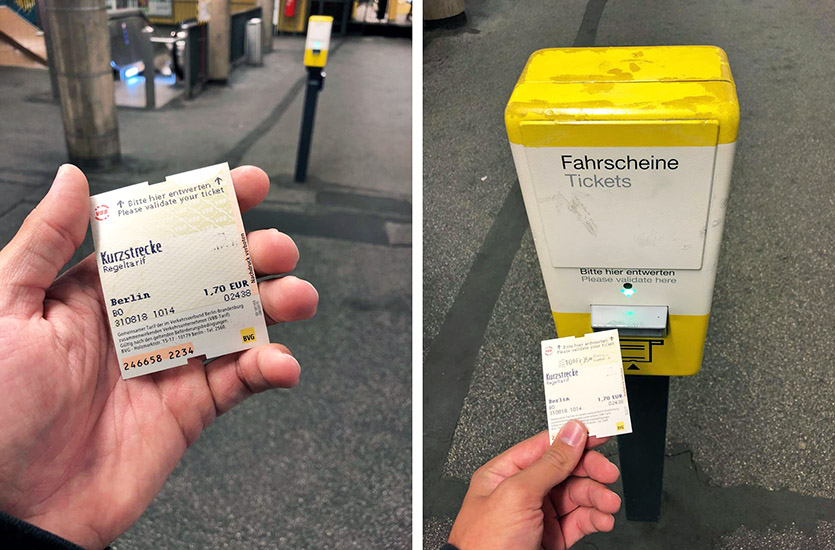 Действительно, в метро Берлина можно заходить свободно, без всяких «кордонов безопасности». Проезд, однако, платный. У входа стоит терминал, который печатает проездные билеты на бумаге, почти как чеки.