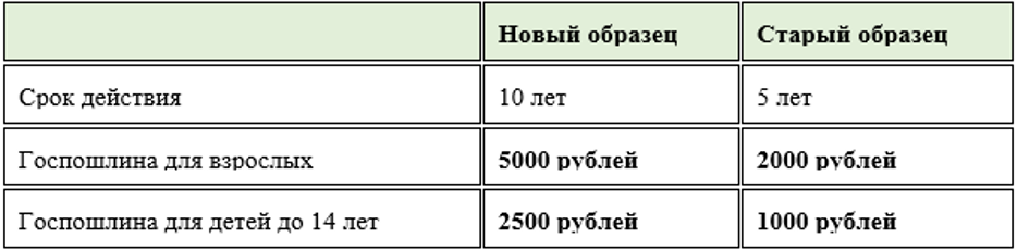 Ниже представлена сравнительная таблица по срокам действия и размеру госпошлин для паспортов разных поколений.