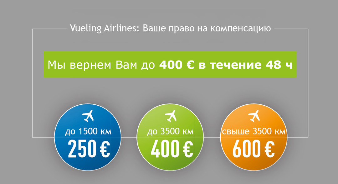 - При расстоянии от 1.500 км до 3.500 км Vueling Airlines должна выплатить Вам 400 €.