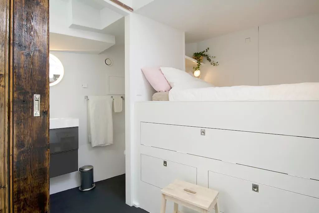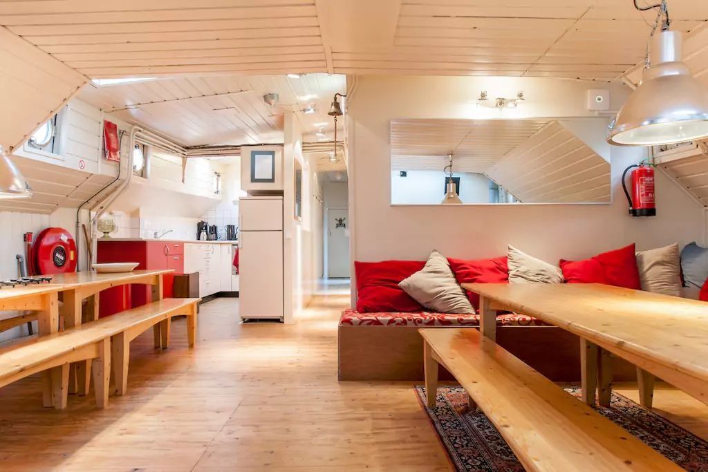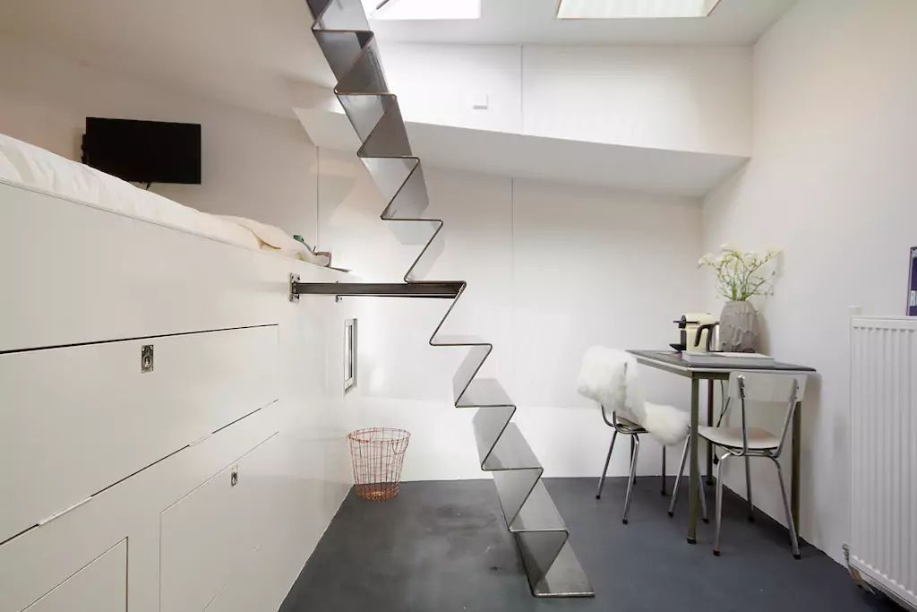 Есть кухня, обеденный столик, двухместная кровать и две скамейки, вай-фай, отопление. На стенах висят два больших зеркала. Дешевый и необычный вариант для тех, кто ищет, где недорого остановиться в Амстердаме.