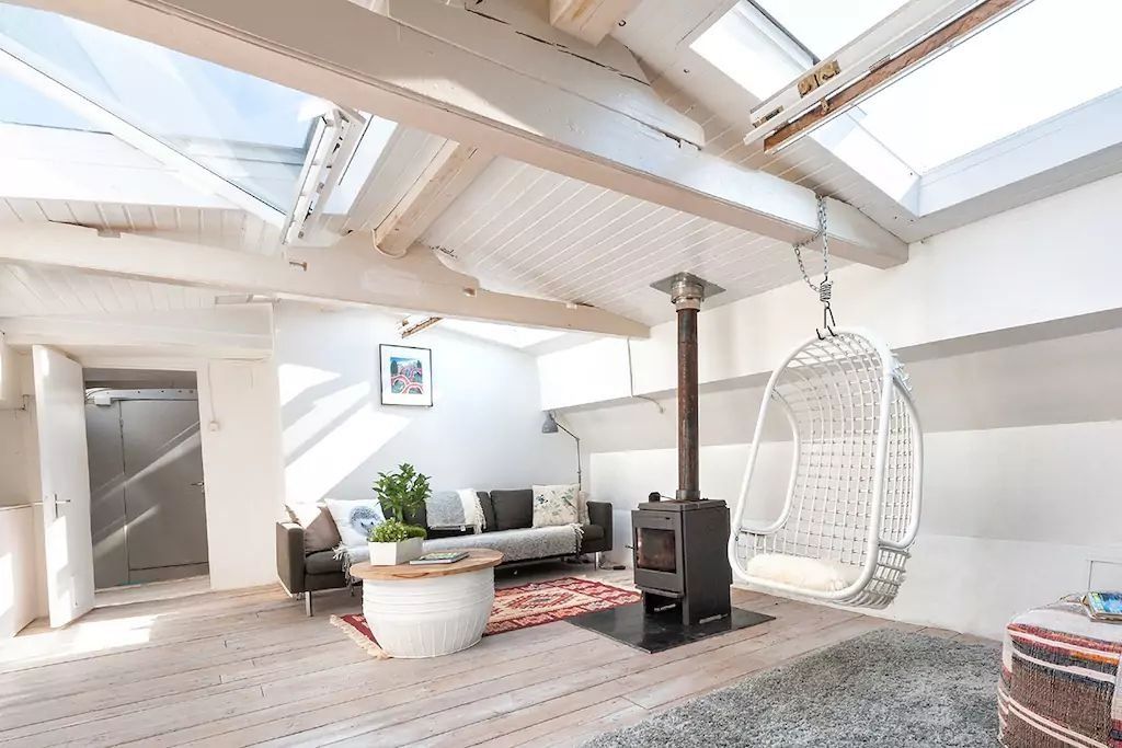 Внутри словно оказываешься в деревенском голландском домике: стоит чугунная печь в гостиной, украшенная плиткой небесного цвета, на полу лежат шкуры и милые коврики, стены и потолок обшиты деревом. Вот она, настоящая домашняя атмосфера!